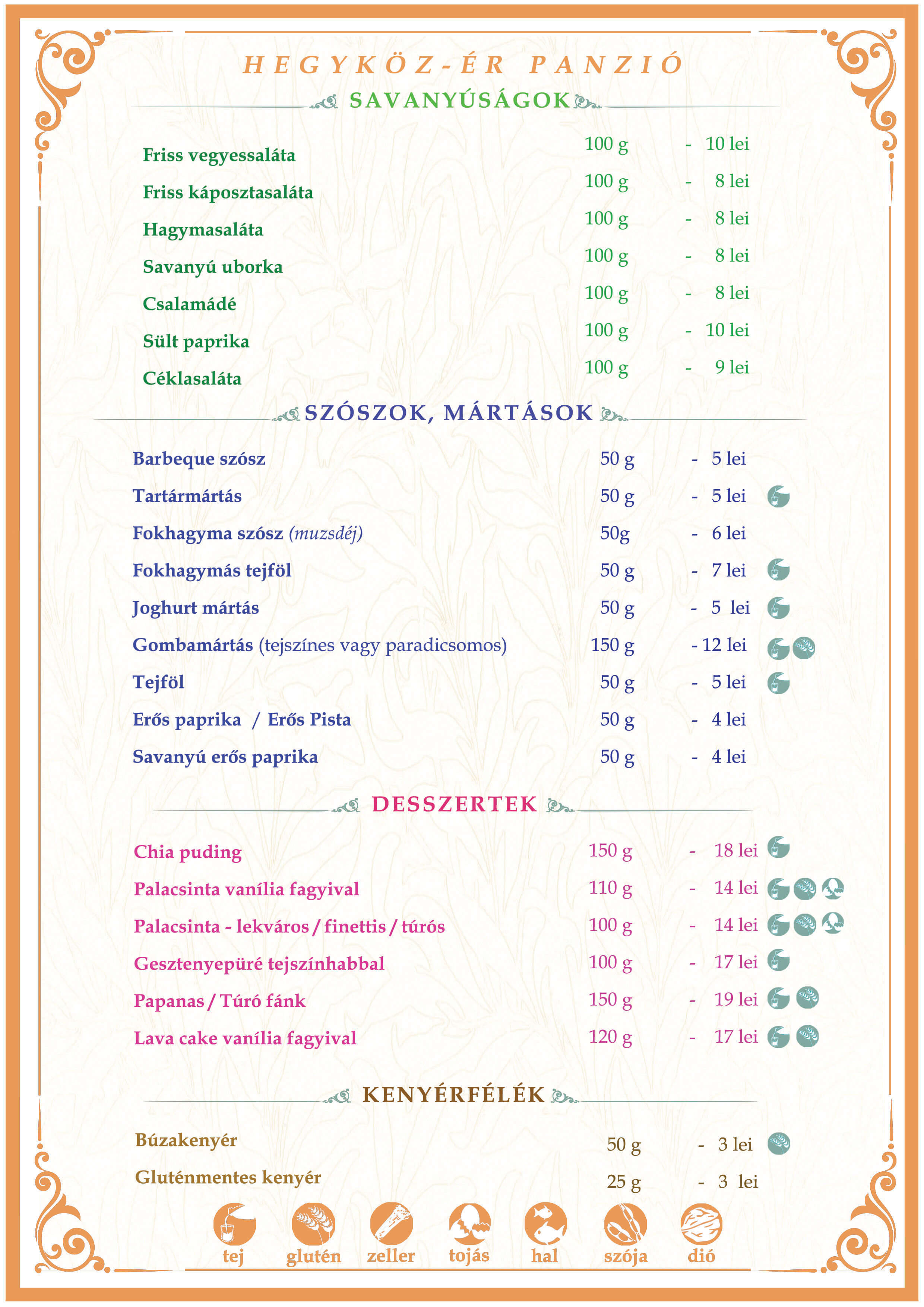 Savanyúságok, szószok, mártások, desszertek, kenyérfélék